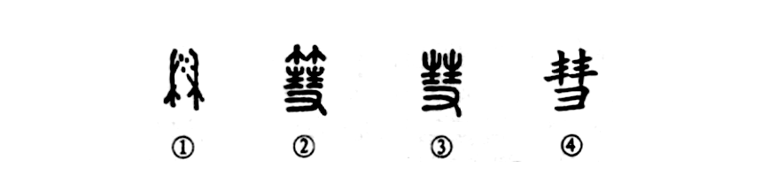 “昭王擁彗先驅(qū)。”這個“彗”字本為會意字。①是甲骨文的形體,像兩把掃帚,上部中間的三個點(diǎn)兒指灰塵。總體表示以帚掃除塵灰。商承祚認(rèn)為:“下掃謂之掃,上掃謂之彗。”②是小篆異體字,其上增加“竹”,表示掃帚是用竹做成,中間是掃帚的訛變之形,下邊為一只手(又)。③是小篆的形體,上部無“竹”。④為楷書寫法。