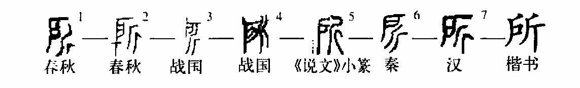 形聲字。《說文》:“所,伐木聲也。從斤,戶聲。《詩》曰‘伐木所所。’”段玉裁注:“伐木聲乃此字本義,用為處所者假借為処字也。若王所行在所之類是也。用為分別詞者,又從処所之義引申,若予所否者、所不與舅氏同心者之類是也。皆于本義無涉,是真假借矣。”桂馥義證:“《詩》曰伐木所所者,《小雅·伐木》文,彼作許許,許所聲相近。”按:“所所”與“許許”都是狀伐木之聲,應該都是借用。所字在傳世和清末以來發現的西周金文中僅宋代著錄的西周晚期敔簋銘文有“所”字:“奪俘人四百,廩于榮伯之所。”傳世文獻中,西周中晚期文獻《詩·大雅》,已習見“所”字用為處所之所。(陳英杰)