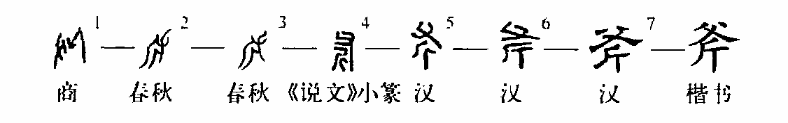 形聲字。《說文》:“斧,斫也。從斤,父聲。”斫指砍伐的意思。斧是用來砍伐樹木的工具,也用作砍伐人的刑具,用處很廣。斧字在商周墓葬中多有出土,與今天之斧基本相同。在甲骨文,斧字就已經(jīng)變?yōu)樾温曌郑?ldquo;斧”字所從的“父”聲旁本是石斧的象形字,本作