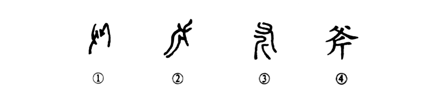 “林木茂而斧斤至焉。”這個“斧”字本為形聲字。①是甲骨文的形體。右邊是“斤(斧頭)”,表形;左為“父”,表聲。②是金文的形體。③是小篆的形體,變?yōu)樯下曄滦蔚男温曌帧"転榭瑫膶懛ā?/span>