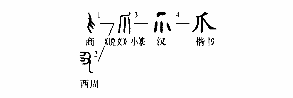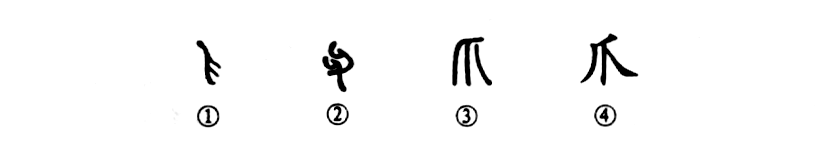 “爪”字是個象形字。甲骨文①就像一只指尖朝下的“爪”形。金文②的形體與甲骨文相反,是指尖朝上。③是小篆的形體,由甲骨文演變而來。④是楷書的寫法,與小篆的形體相類似。