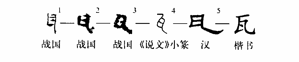 ”,為《說文》篆文所本。本義是瓦器。《說文》:“瓦,土器已燒之總名。” 《古陶文匯編》5·384:“以為瓦書。” 《古陶文匯編》5·304:“左司涓瓦。” 《荀子·性惡》:“夫陶人埏埴而生瓦。”這些意義的“瓦”字讀為wǎ。又作動詞,鋪瓦。《急就篇》:“榱椽欂櫨瓦屋梁。”顏師古注:“瓦屋,以瓦覆屋也。”這種意義的“瓦”字讀為wà。(徐在國)
