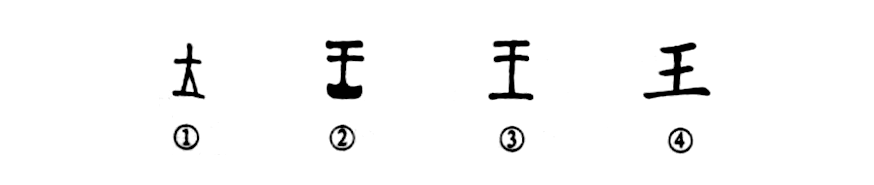 “帝王將相寧有種乎!”這個(gè)“王”字是個(gè)象形字。甲骨文①是個(gè)斧頭之形,下端是斧刃。金文②也基本上同于甲骨文的形體,不過(guò)下端的斧刃更像實(shí)物,如同古代武士所拿的大板斧。小篆③的形體是由全文演變而來(lái)。④是楷書的寫法。