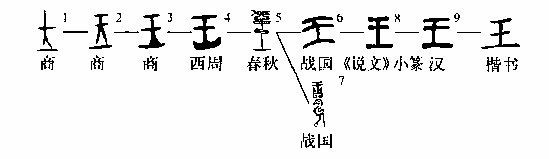 ”演變)。以斧鉞象征王權(quán)。本義是指古代最高統(tǒng)治者。《說(shuō)文》:“王,天下所歸往也。”《爾雅·釋詁上》:“王,君也。”《禮記·內(nèi)則》:“后王命冢宰,降德于眾兆民。”陸德明釋文:“王,天子也。”這種意思的“王”今天讀wáng。“王”字引申之又有統(tǒng)治之意。《詩(shī)·大雅·皇矣》:“王此大邦,克順克比。”《史記·項(xiàng)羽本紀(jì)》:“先破秦入咸陽(yáng)者王之。”即其例。這種意義的“王”今天讀wàng。甲骨文早期“王”字作“