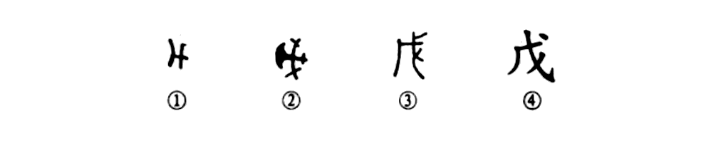 這個“戊”字是個象形字。甲骨文①像一把長柄寬刃的大斧,刃部朝左,像彎月形。②是金文的形體,中間更像一把大斧之形。③是小篆的形體,沒有斧頭的模樣了。④是楷書的寫法。