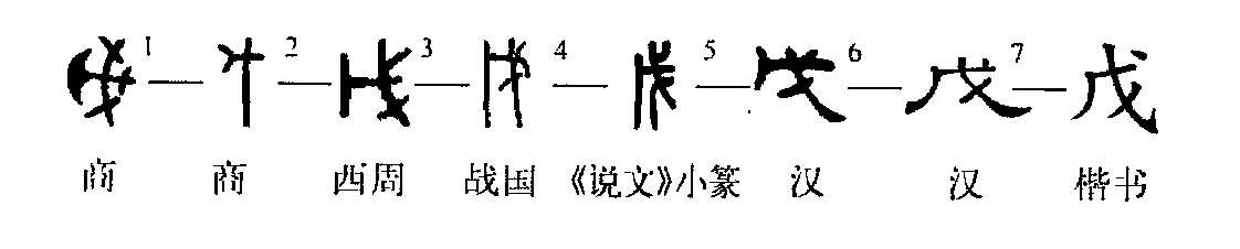 ”,將右上角的一筆變成孤懸的點就是楷書的樣子了。本義當為兵器名。“戊”字在甲骨文中就已經假借作天干第五位的代稱,并成為此義的專用字。《說文》:“戊,中宮也。象六甲五龍相拘絞也。”這是用漢代盛行的陰陽五行之說來附會的,清江藩《六甲五龍說》:“予謂天數五,地數五,自甲至戊其數五,居十之中。《漢書·律歷志》:‘五六者,天地之中和。’故曰:‘戊,中宮也。’”(王穎)