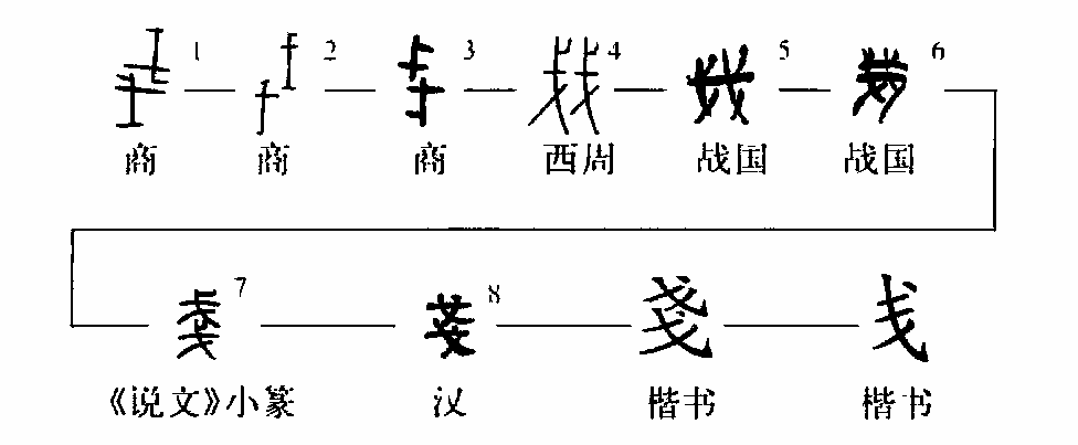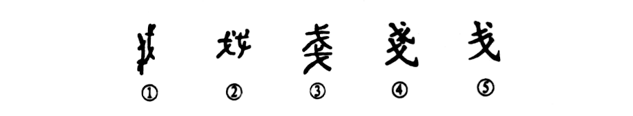 這是“戔戔微物”的“戔”字,讀作cán,本為會意字。甲骨文①像兩戈相向,當為“殘”的初文。②是戰國楚簡文字,兩戈并列。③是小篆的的形體,兩戈上下結構。④為楷書繁體字。⑤為簡化字。