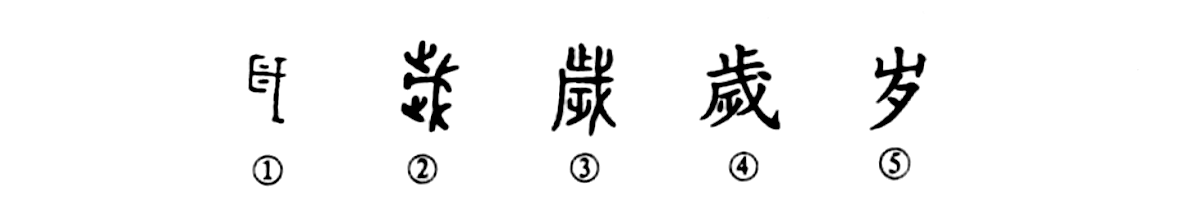 “雁塔風霜古,龍池歲月深。”這個“歲”字本為象形字,甲骨文①就像長柄的斧鉞之形,斧刃朝左,其中的兩個小點表示斧刃上下尾端回曲中之透空處。②是金文的形體,原來的二小孔變成兩個“止”,上下二“止”組成“步”。夏代稱年為歲,取“歲星”運行一次為一歲(即一年),也相當于大自然向前跨過一步,所以“歲”字從“步”。③是小篆的形體,與金文相似。④為楷書繁體字。⑤為簡化字。