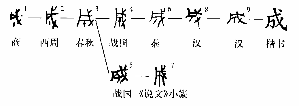”,前者的刃部較后者寬大,應是不同的兵器。這種差別在各個時期的文字中一直存在。春秋時期,下方寫作短豎的“丁”與上面“戌”的短橫相連,并在短豎的中部加點作裝飾,戰國時期曾出現變點為橫的異體。秦漢時寫作“