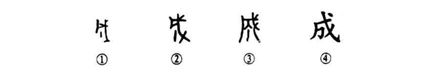 “美言系之,玉成其事。”這個“成”字本為會意字。甲骨文①的左下角像一塊木狀物,其右邊是一把長柄板斧,以斧劈物,表示“成盟”(實為古代的建交儀式)。②是金文的形體,其右邊的彎柄大斧實在形象。到了小篆③變化較大,從原來的會意字變成了形聲字,也就是外形(戊)內聲(丁)的形聲字。④是楷書形體。
