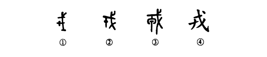 這是“萬里赴戎機”的“戎”字,是個象形字。①是甲骨文,中間左側的“十”是“盾牌”的形象,右邊是“戈”,可見“戎”也是一種兵器。②是金文形體,其中“十”字是兩端尖中間圓,更像“盾”形。③是小篆的形體,發生了訛變,將“盾牌”形變為“甲”。④是楷書形體,跳過小篆,直接繼承了甲、金文的寫法。