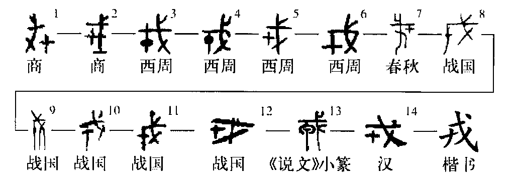 會意字。從戈、從甲,會兵甲之意。古文字“戎”字從戈、從