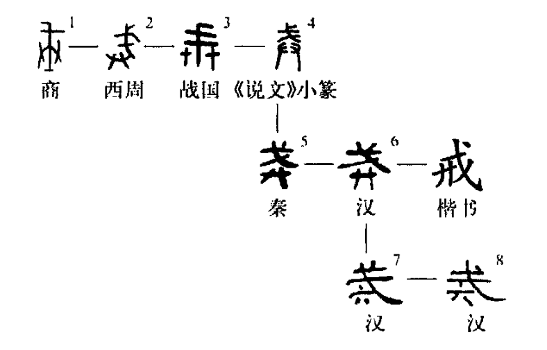 會意字。以雙手持戈會警戒意。《說文》:“戒,警也。從廾持戈,以戒不虞。”論形說義,都很精當。現代漢語“警戒”、“戒備”中的“戒”,用的還是本義。(李守奎)