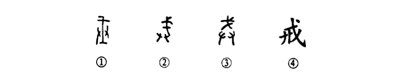 這個“戒”字是個會意字。甲骨文①的中間是一把長“戈”,下部的左右兩側是緊握鋒戈的兩只手,以戒不備之敵。金文②的結構基本上與甲骨文相似,只是雙手均在戈的左下側。③是小篆的形體,是由金文直接演變而來,不過雙手移到了戈下。④是楷書的寫法,但形體發生了偽變,雖然“戈”形猶在,但雙手已變為“廾”,根本沒有手形了。