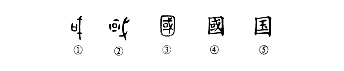 這是“漢皇重色思傾國”的“國”字。甲骨文①的形體就是“或”字,右為“戈”,左為“國”,以戈衛(wèi)國。可見在甲骨文中,“或”與“國”是不分的。金文②左邊中間的圓圈是表示國土,周圍的四條短線表示國界,右邊有“戈”,也是以戈衛(wèi)國之意。可見這個“國”字是個會意字。到了小篆③則在“或”字之外又增加一個“口”,表示國界,這就變成了外形(口)內聲(或)的新形聲字了。④是楷書形體。⑤是簡化字,“國”中有珍寶(玉),變成了書寫方便的新會意字了。