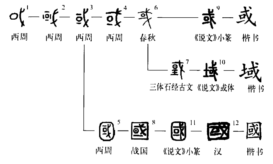相交而成“戈”字(為后世文字所本)。因借用為或然之“或”及疑惑之“或”,遂加“口”旁作“國” (字形5),或加“邑”旁作“