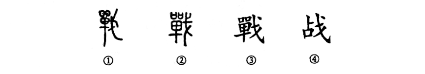 這是“鏖戰沙場”的“戰”字。本為會意兼形聲的字。①是金文的形體,左邊為“單”,右邊為“戈”。“單”的本義是捕捉工具,亦表聲,加“戈”突出了作戰之意。②是小篆的形體。③是楷書的形體。④為簡化字,是一個單純的形聲字了。