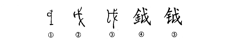 “戉”是“斧鉞”之“鉞”的本字,讀作yuè。甲骨文①就像商、周青銅兵器的形狀,上部朝左的部分是“鉞刃”(似斧頭),下部是長柄,可見“戉”是個象形字。②是金文的形體,與甲骨文相似。③是小篆的形體,已經看不出“鉞”的模樣了。④是楷書,左邊又增加了形符“金”,成為左形右聲的形聲字了。⑤是簡化字。