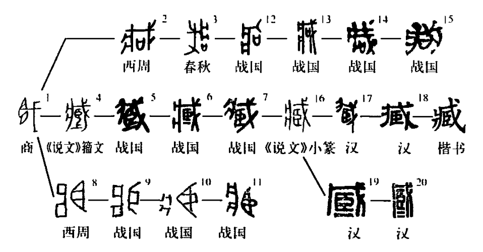 字上又加形旁攴(蓋取意于對臧獲可任意鞭撻)。作為小篆正體的從臣戕聲的臧字是這時出現的,即《說文》籀文。其所以不用口、攴而以臣為形旁,可能受到甲骨文會意字??的影響,甚至可以說是以爿或戕對??的聲化改造。籀文臧字臣下的