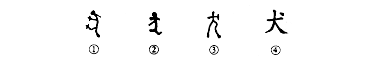 “犬守夜,雞司晨。”“犬”就是狗。甲骨文①是一只頭朝上、尾朝下、腿朝左的狗。金文②就更像狗的樣子了,頭上左右兩側是兩只耳朵,下部的尾巴向右上卷起。小篆③則不像狗的樣子了。④是楷書的寫法,“大”字加一點,完全失去了狗的形象。