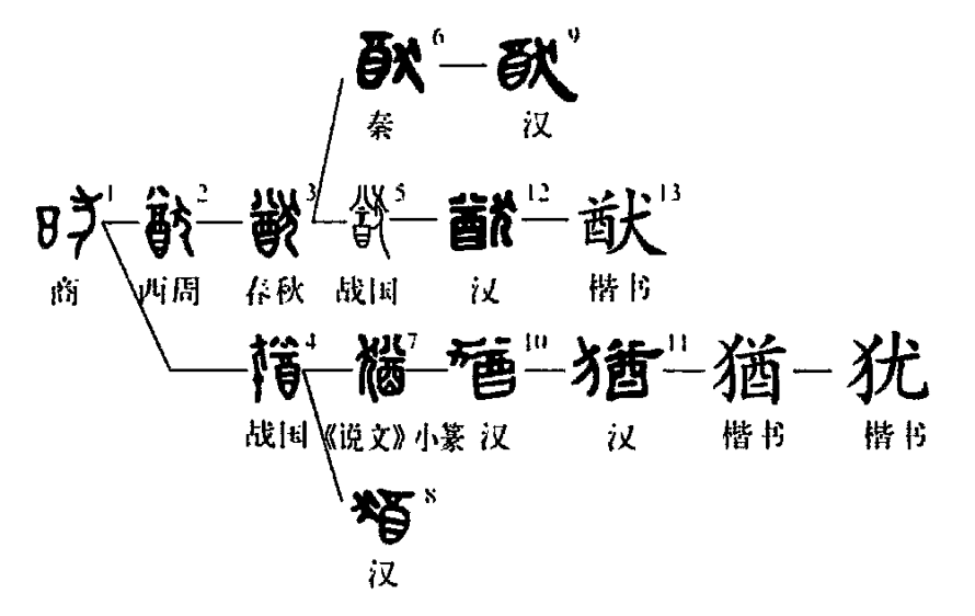 形聲字。從犬,酋聲。本義為猴類動物。《說文》:“猶,玃屬。”《爾雅·釋獸》:“猶如麂,善登木。”郝懿行義疏:“猶之為獸,既是猴屬,又類麂形。麂形似麕而足如狗,故猶從犬矣。”也叫“猶猢”,《水經注·江水》:“山多猶猢,似猴而短足,好游巖樹。”因同音的關系,“猶”的字形被假借來用作動詞、副詞,表示如同、好比、還、仍、尚且等義。甲骨文左為酒壇形的“酉”,右為“犬”;金文酒壇上增加了溢出的酒水形而為“酋”。后字形分化,左“酋”、右“犬”演變成“猷”,義為謀略、計劃。西周中期史墻盤:“遠猷腹心。”左“犬”、右“酋”演變成“猶”。現代漢字簡化時,根據唐代敦煌變文寫本及元抄本中出現過的字形,將“猶”簡作“猶”。(郭小武 葉青)