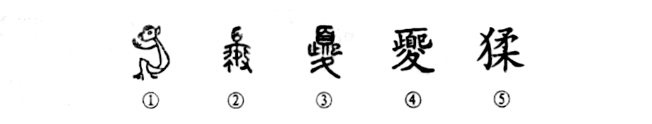 這個“猱”字讀作náo,本為象形字。①是甲骨文的形體,是猿類動物,身體便捷,善于攀援。②是金文的形體,變得不像了。③是小篆的寫法。④為楷書的寫法。⑤為后世通行楷書體,變象形為形聲。