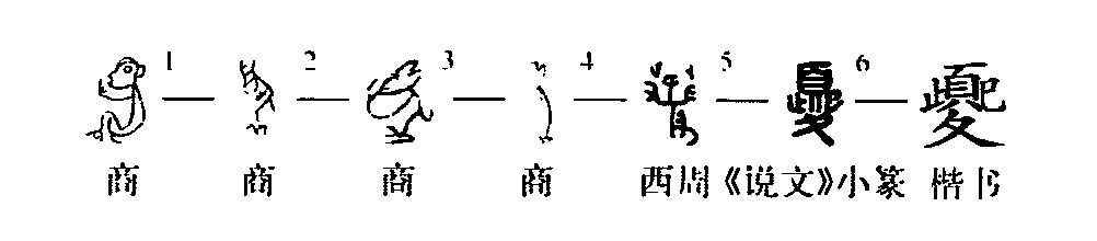 象形字。像獼猴形。《說文》訓夒為“貪獸也。一曰母猴”。母猴亦作獼猴解,因為象形字有局限,無法表示其性別。在商代甲骨文中,夒有勾勒形與單純線條形之別。甲骨文夒為側立之形,除表現獼猴頭部有耳、目、口,身體上有又(手)、下有止(足)之外,還著意表示有尾之形。偶或省略尾形,字亦可識,但不屬于標準寫法。周代夒字寫法出現繁復變化。甲骨文夒用做高祖名,學者多以為指帝嚳。西周金文夒或假為擾,銘文記牧牛誓曰:“自今余敢夒乃小大史(事)”,意即從今天起我若是敢擾亂您的大小事情。(劉桓)