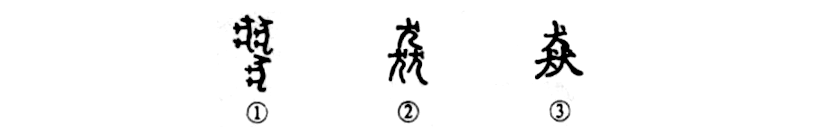 這是個“猋”(biāo標)字。金文①上邊是兩條狗(犬),下邊是一條狗,一共三條狗,它們都是頭朝上,尾朝下,腿朝左,背朝右。這個“猋”字的本義就是“眾犬狂奔貌”,所以是個會意字。②是小篆的寫法,除筆形改變而外,整體也有變化,變成一“犬”在上,兩“犬”在下(一個漢字如是三個同體相重,均為上一下二,似乎已是一條規律)。③是楷書的寫法。