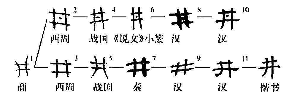 象形字。《說文》:“象構韓(井欄)形。”用四木交搭像井口圍欄。“井”字早已行于商代,入西周后,或在中空處添加圓點為飾,《說文》以為“甕(汲瓶)之象也”,可備一說。西周中晚期,不加飾點的字形和加飾點的字形曾出現過分化寫詞的趨勢,但最終沒能成功。僅有一點之差的繁簡二體卻并行至東漢。楷書從簡,取中間無點的形式為規范。本義是水井。《易·井》:“改邑不改井。”(改建城邑而不改水井)詞義縮小,就僅指井欄。井欄不能隨意越過,因此引申為法度、法則、懲罰,這些意義在周金文多有用例,而在典籍則寫作“刑”或“型”。“井”由本義比喻引申,可指類似井的建筑,如鹽井、礦井、天井等。先秦用“井”字字形描述一種土地制度——井田制:把一里見方的土地劃分成如“井”字形的九塊,每塊百畝,八家各分一塊,中間一塊為公田,所以《說文》說“八家一井”。(金國泰)