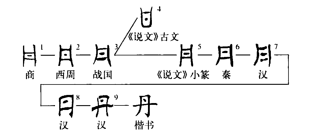 象形字。像竹筒里盛放著朱砂形。字形中間的點(diǎn)畫,表示朱砂,為了表意明確,用盛朱砂的竹筒形烘托。“丹”字從殷商甲骨文至小篆沒有明顯變化,兩條橫線夾在兩條豎線間,豎線上下都長出于橫線。至秦簡(jiǎn),豎線高出部分已不明顯,與頂橫近于平齊,漢隸發(fā)展為頂橫右端折轉(zhuǎn)向下,連接右豎而成為一筆,寫作“” (《說文》古文與此形顛倒相對(duì),變化道理近似,只是變化在底部),原來居下位的長橫又向兩邊延伸,穿透左右豎線,全字演變成“丹”形。楷書把內(nèi)部短畫或橫點(diǎn)變作斜點(diǎn)。《說文》:“丹,巴、越之赤石也。”說丹是西南地區(qū)出產(chǎn)的朱砂。“丹”本義就是朱砂。西周庚嬴卣:“易(賜)貝十朋,又丹一。” (王賞賜庚嬴二十串貝,又賞賜一管朱砂)引申為朱紅色。因道家煉藥多用朱砂,所以引申出道家煉制出的藥物一義。(金國泰)