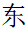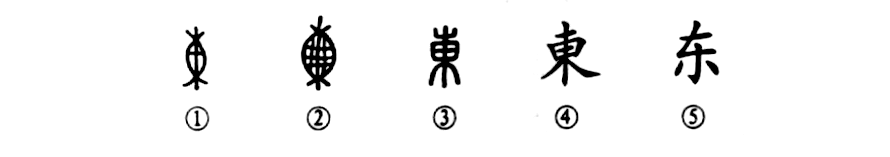假借字。商代金文作(字形1),甲骨文省作(字形2),亦作(《甲文編》 266頁),像兩頭用繩索扎住的橐(一種無底的口袋),是“束”字的初文(參見束部“束”字條),也是“橐”字的初文(參見?部“橐”字條)。因東方之“東”無形可像,故借音近的“束”字來表示(“東”端紐、東部,“束”書紐、屋部。端、書均屬舌音;東、屋陽入對轉),后分化成(東)、(束)、(橐,后作。僅見于偏旁)三字。不過,偶爾還可以看到借“束”為“東”的例子。鼎:“隹(唯)周公于征伐(東)尸(夷)。”曾侯乙墓漆衣箱上朱書二十八宿有:“(東)縈(營)”、 “(東)井”。本義指日出的方向。《詩·邶風·日月》:“日居月諸,出自東方。” 《史記·項羽本紀》:“縱江東父兄憐而王我,我何面目見之? ”引申指往東。《左傳·僖公三十二年》:“秦師遂東。”新中國成立后,“東”簡化為“東” (據草書楷化)。(冀小軍)
