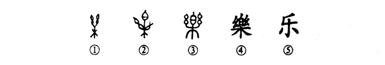 “鐘鼓樂之。”這個“樂(yuè)”字本為象形字。甲骨文①是“弦附木上”的形象,像古代琴的樣子。正如郭沫若先生所說:“樂字之本為琴。”②是金文的形體,中間的“白”“乃象調弦之器”。③是小篆的形體,由金文直接演變而來。④是楷書繁體字。⑤為簡化字,是草書楷化的形體。