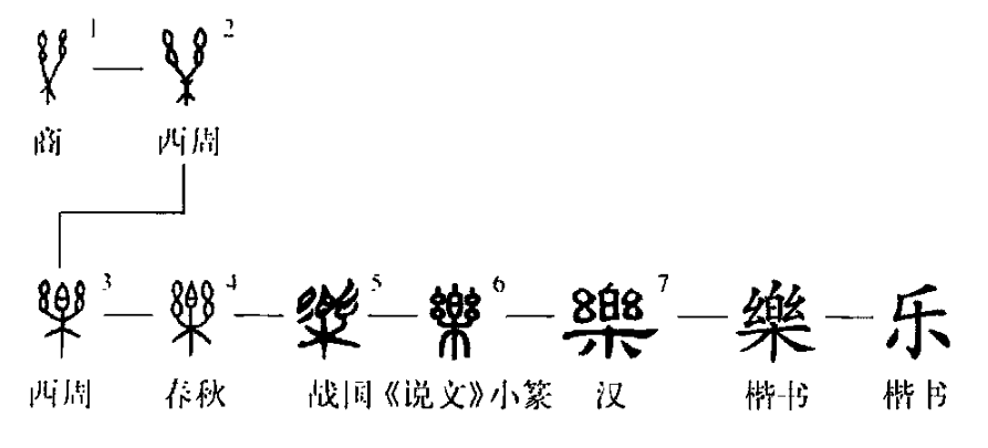 會意字。商代文字從??(絲之初文)、從木,會樂器之弦附于木上之意。西周金文增,或以為像調弦之器。本義指音樂(音yuè)。《說文》:“樂,五聲八音總名。”《廣韻·覺韻》:“樂,音樂。”《荀子·樂論》:“夫聲樂之入人也深,其化人也速。”又指樂器。《荀子·王霸》:“齊桓公閨門之內縣(懸)樂。”又指樂工。《論語·微子》:“齊人歸(饋)女樂,季桓子受之,三日不朝,孔子行。”引申指快樂(音lè)。《廣韻·鐸韻》:“樂,喜樂。”《論語·學而》:“有朋自遠方來,不亦樂乎?”又指樂于。《戰國策·楚策一》:“法令既名,士卒安難樂死。”又引申指喜好(音yào)。《廣韻·效韻》:“樂,好也。”《論語·雍也》:“知者樂水,仁者樂山。”陸德明釋文:“樂,五孝反。”邢昺疏:“樂,謂愛好。”漢代草書“樂”字多作(見《漢代簡牘草字編》111頁)。清刊《嶺南逸史》“樂”字作“樂”(《宋元以來俗字譜》57頁)。新中國成立后,“樂”簡化為“樂”。(冀小軍)