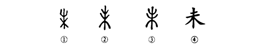 “來日綺窗前,寒梅著花未?”這個“未”字本為象形字。①是甲骨文形體,像穗的形狀。郭沫若先生認為“未”就是“穗”的本字。②是金文的寫法,類似于甲骨文。③是小篆的形體。④是楷書的寫法。