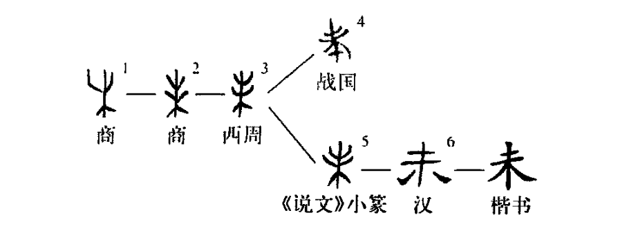 《說文》:“未,味也。”不妥。其本義應為“穗”,后因“未”字被假借為地支第八位用了,所以再造一個“穗”字來代替“未”所表示的本義。
