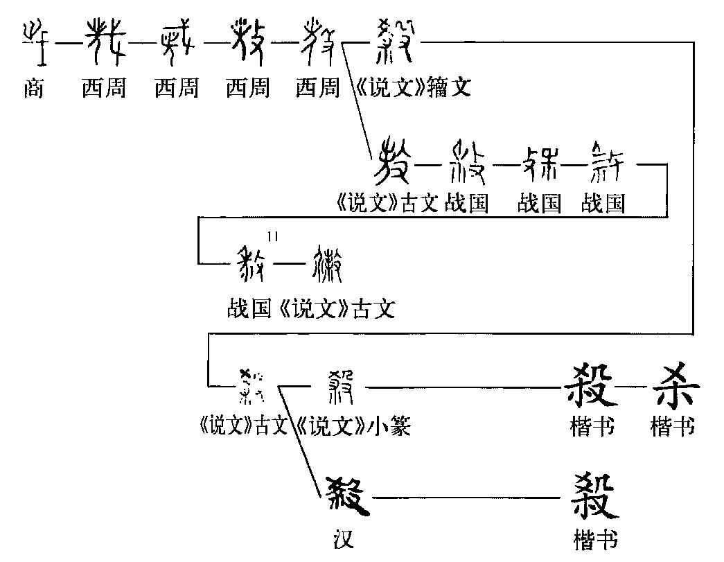 初為會意字。商代甲骨文從戈,截斷人散發以示殺戮。到西周時,散發下加人,殺戮之義更明顯;同時與戈由粘合而分離,聲旁殺獨立出來,戈旁或作攴旁。戰國時,構件散發作、、、、、、、、、;構件人作(左右兩點是散發中兩點的下移)、、、,或作(介),有聲化趨向,《說文》古文則以為疊加聲旁,殺與介并月部。散發與人之間或加、、,蓋表割殺、截斷意。攴或作殳,屬于形義相近偏旁的更替。《說文》籀文從雙乂(yì),含切割義,亦表音,乂與殺亦并月部。散發與人作,亦之訛變。秦系文字省雙乂為單乂,散發與人作、或,基本上同于籀文。《說文》小篆承襲了秦文字的主流結構,隸變后楷書作殺,簡化字作殺。承襲籀文的,楷書作毅,罕用。漢碑中或作、、、、,并俗體。本義為殺戮、處死。《左傳·昭公元年》:“周公殺管叔而蔡(竄)蔡叔。”引申指征伐、屠戮。《合集》37854:“其隹今九祀(年)正殺?”《甲骨綴存》31:“壬辰卜,??貞:戉殺湔方?”引申指攻克、戰勝。墻盤:“粵武王既殺殷。”引申指除、滅。云夢秦簡《法律答問》:“小畜生入室,室人以杸(殳)梃殺伐之。”馬王堆漢墓帛書《陰陽五行》甲編:“斬伐殺生以祭天鬼,大吉。”用作人名。殺乍父戊鼎:“殺作父戊。”以上讀shā。引申指削減、捐耗、零落,讀shài。引申指暗淡,讀sà。同“弒”,讀shì。蹩殺,聯綿詞,旋行貌,讀xuē。通“噦”(huì),噦噦,徐行有節。莒叔之仲子平鐘:“雍雍殺殺。”通“試”,用。《淮南子·主術》:“威厲而不殺,刑錯而不用。”(張標)