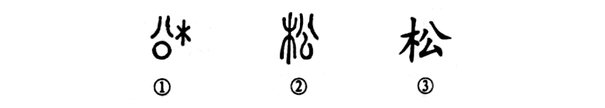 ?“下簾危坐聽松濤。”這個“松”字是形聲字。①是金文的形體。左邊是“公”表聲;右邊為“木”,表形。②是小篆的形體,將金文的“公”與“木”的位置對換過來。③是楷書的寫法。