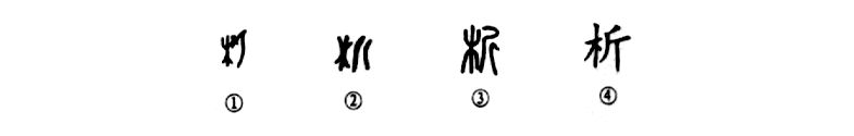 這個“析”字是個會意字。你看甲骨文①的形體,其左邊就是一棵樹(木),右邊是一把平刃曲柄的大斧頭(錛屬),是用斧砍樹(木)的意思。②是金文的寫法,其左邊仍是木,右邊的大斧頭變為“斤”形,不太像斧頭的樣子了。小篆③是直接由金文蛻變而來,形體基本相似,只是把直筆變為曲筆罷了。④是楷書的寫法,也是從“木”從“斤”,沒有發生過偽變。