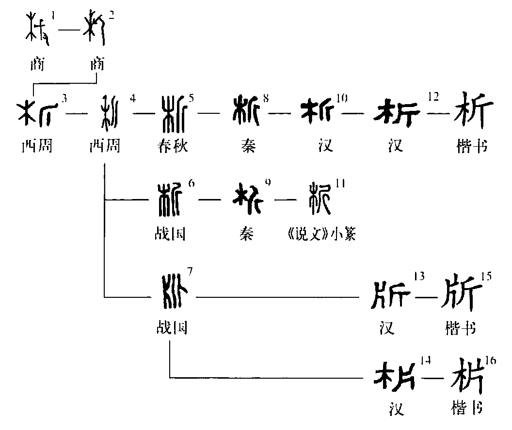 會意字。商代金文(字形1)像手持斧破木之形;甲骨文(字形2)省去手形,又用較常見的“斤”字替代了像斧形的部分(斧、斤是同類的工具。參見斤部“斤”字條)。西周文字從木、從斤。春秋文字(字形4)“木”旁訛為“禾”。戰國文字(字形5)承襲商周文字,從木、從斤,為秦漢及后世文字所本;字形6“斤”旁上部彎曲,為秦代隸書或體及《說文》小篆所本;字形7改從“木”為從“片”(像破開之半木形),取意相同,為漢代隸書或體所本。受這種寫法的影響,漢代隸書中還出現了從“木”從“片”的俗體。“析”,本義是劈開(木頭)。《說文》:“析,破木也。” 《廣韻·錫韻》:“析,字從木、斤。?,俗。”《集韻·錫韻》:“析,或從片,古作版。”《詩·齊風·南山》:“析薪如之何? 匪斧不克。”漢王充《論衡·量知》:“斷木為槧,?之為板,力加刮削,乃成奏牘。”引申指分開,分散。《廣韻·錫韻》:“析,分也。”《書·盤庚下》:“今我民用蕩析離居,罔有定極。”成語有“分崩離析”。又引申指分析,剖析。晉陶潛《移居》二首之一:“奇文共欣賞,疑義相與析。”(冀小軍)