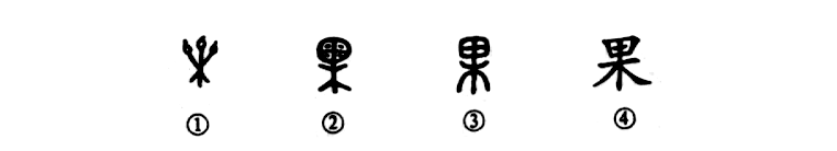 ?這是“碩果累累”的“果”字。這是個(gè)象形字。甲骨文①的下部是“樹”(木),樹梢上結(jié)滿了果實(shí)。②是金文的形體,是在“木”上長了一個(gè)又圓又大的果實(shí)。③是小篆的形體。④是楷書的寫法,都是由金文演變而來的。