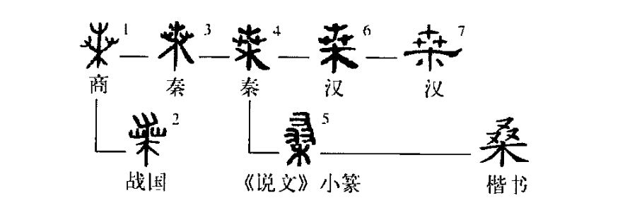 至秦代文字(字形4)及《說(shuō)文》小篆,枝葉已完全與樹(shù)形脫離,前者變從“芔”,后者變從“叒”。