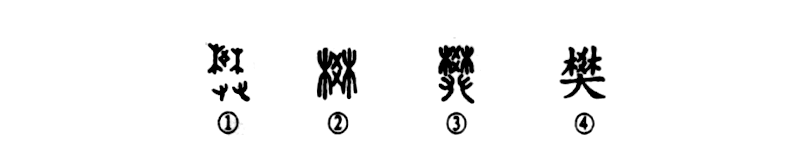 “久在樊籠里,復得返自然。”這個“樊”字本為會意兼形聲的字。①是金文的形體,上部為籬笆之形,下部是一雙手,表示雙手編織籬笆。該字的上部既表意也表音。②是小篆的形體,省掉了兩只手,頗像園圃周圍的籬笆的樣子。③也是小篆的形體,由金文演變而來。④是楷書的寫法。