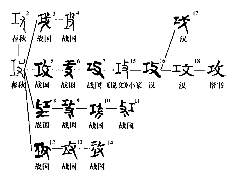 形聲字。從攴,工聲。形旁攴為手持械具以擊狀,表示攻的本義與擊打有關(guān)。聲旁工蓋為矩形,于攻表音,工與攻并見紐東部。源頭、聲首與初文是工,商周甲骨文、金文已見。古初以工為攻,后乃為造專字。《石鼓文》“車既工”,《詩》作攻即其證。攻字最先見于春秋,時(shí)形旁或作又,又與攴屬于形義皆近偏旁的通用。戰(zhàn)國時(shí)主流結(jié)構(gòu)是沿襲前代的從攴工聲,但形旁與聲旁所處上下左右的位置尚不固定。非主流變化主要是形旁攴或作戈、殳,亦屬形義皆近偏旁之更易,不影響本義的表達(dá);攴加飾筆作等;聲旁工加飾筆作等。隸變時(shí)形旁猶有作戈者,聲旁或美化作,楷書最后作攻,主要是小篆的筆勢變化。《說文》本義是進(jìn)攻,攻擊。疐鼎:“攻(?)無啻(敵)。”郭店楚簡《尊德義》:“正(征)欽(陷),所以□(也)。”引申指專力于。郭店楚簡《成之聞之》:“不求者(諸)其(本)而(攻)者其末。”又引申指事。叔夷鐘:“女肈敏于戎攻。”此義不簋作“工”,《詩·大雅·江漢》作“公”,毛傳訓(xùn)事。通“工”,勞作。云夢秦簡《秦律十八種·倉律》:“城旦舂、舂司寇、白粲(皆刑徒)操土攻。”官名。楚有“工尹”之官,曾侯乙墓竹簡作“攻尹”、“大攻尹”、“少攻尹”等。通“功”,成功。郭店楚簡《老子》甲本:“攻(功)述(遂)身退。”通“工”、“句”,發(fā)聲詞。春秋時(shí)吳王夫差金文中作“攻敔(吳)王”、“工?(吳)王”,《史記》作“句吳”。(張標(biāo))