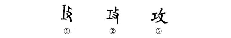 這是“攻城不畏堅(jiān)”的“攻”字。①是金文的形體,其左是個(gè)“工”字,其右是個(gè)“攴”字;“攴”字的本身就有攻打的意思,所以“攻”字是一個(gè)左聲右形的形聲字,其本義就是攻擊(或攻打)。②是小篆的寫法,其形體與金文基本相似。但是到了楷書③就大變樣了,表意的“攴”旁變成了“攵”(反文旁)。照形聲字的結(jié)構(gòu)原則說,“文”字的意義與“攻擊”的意義沒有什么聯(lián)系,所以這種變法最初是變錯(cuò)了,后來人們在書寫時(shí)也就將錯(cuò)就錯(cuò),以至于約定俗成了。