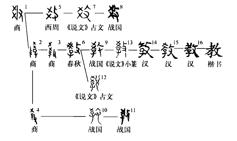 形聲字。商代甲骨文初作從攴,爻聲。形旁攴為手持器械施教形,表示教的本義與施教有關。聲旁爻像器物交織形,于教字表音,爻與??(教)并為宵部。后蓋為突出教育兒童義,復加表意偏旁子,遂為從攴從子爻聲之教。商代的??經歷西周、戰國到漢代始終存在,但不被《說文》收錄。主流體教字出現后商代出現爻省聲的異體,此體延續到戰國,后不傳。戰國時主流體教經常省略構件攴作??(見郭店楚簡《老子》甲本)。隸變時構件爻或作、、,或作、、,楷書作教,是筆勢、筆意變化的結果。古施受同詞,教學同字,后代分化為二字。故靜簋之學,或讀教(參“學”字條);楚簡之教,或讀學(見本條下),《古文四聲韻》以??為學。正因為二字有著這種關系,所以在字形上也有所體現。西周時的與,結構上都是早期學與教的結合(參“學”、“敩”字條)。《說文》本義為“上所施,下所效”,即政教、教育、教令。《書·舜典》:“敬敷五教。”孔穎達正義:“布其五常之教。”郭店楚簡《老子》甲本:“行不言之??。”又《唐虞之道》:“民又(有)(尊)也。”引申指管教、訓練、學說等,以上讀jiào。又指傳授,使,令等,讀jiāo。《殷契粹編》1162:“其教戍?” (要授以防戍嗎?)馬王堆漢墓帛書《繆和》:“我教子祝之。”通“校”,古代“校人”之官。《周禮》言其“掌王馬之政,辨六馬之屬”。散氏盤有“教父”。通“學”。郭店楚簡《語叢三》:“牙(與)曼(慢)者施凥(處),員(損);牙(與)不好教者遊,員。”甲骨文用作地名。《小屯·殷虛文字甲編》206:“戊戌卜,雀(人名)芻(取草)于教? ”(張標)