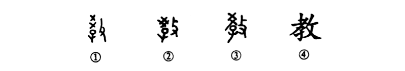 古人說:“教不嚴,師之惰。”大意是:教得不嚴,是老師的怠惰。“教”字是個會意字。甲骨文①右邊是一只手拿了一條教鞭(或棍棒),左下方是個“子”(小孩),“子”上的兩個叉是被教鞭抽打的象征符號。這就是古代“棍棒政策”的教育,一邊打還一邊嘮叨:“不打不成材!”金文②與甲骨文的形體相似,只不過“子”上面的部分不同而已。小篆③又同于甲骨文的形體。④是楷書形體。宋朝的理學家朱熹,對古文字學不太內行,他說:“‘文’‘孝’謂之‘教’。”他把右邊的“攴”看成“文”,這就錯了。