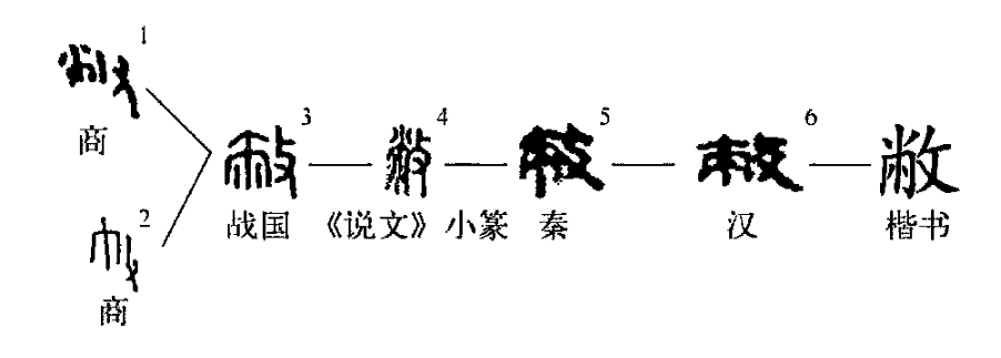 會意兼形聲字。從?,從攴,?亦聲。甲骨文從攴,從巾。右邊是手持木棍抽打巾,左邊的“巾”是一塊布,布上的點表示破碎的布屑。戰國文字承襲甲骨文。右邊“”演變成“攴”,字右邊的“攴”多寫成“攵”,楷書寫作“敝”。本義是敗衣,破舊的衣。《詩·鄭風·緇衣》:“緇衣之宜兮,敝,予又改為兮。”引申為破舊。《易·井》:“甕敝漏。”又有疲憊衰敗之意。《漢書·張敞傳》:“吏民凋敝。”引申為謙詞,對自己或自己一方的謙稱。如:敝國,敝姓。(胡偉 郭敏珊)