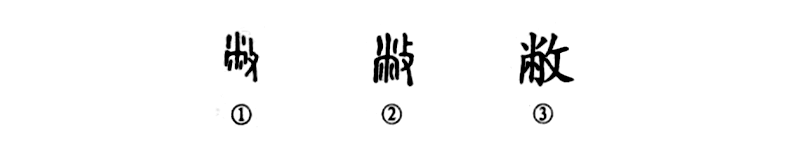 這是“敝帚自珍”的“敝”字,是個會意字。甲骨文①左邊的中間是“巾”(上古的“巾”即為“布”),其右是手持木棍之形,意思是手持木棍抽打一塊布。左邊的四個點兒,即為打破后掉下來的布屑。小篆②的形體與甲骨文基本相似③是楷書的寫法,是直接從小篆演變而來的。