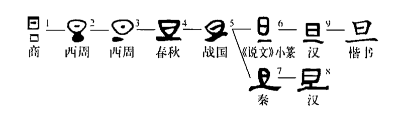 指事字。初文像太陽破土而出之形,“日”下面像土地之意,填實與勾勒意同。至戰國文字時,“土”又訛變為“一”,小篆的字形就是由此而來。甲骨文:“……旦至于昏不雨。大吉。” (《合集》29272) 《說文》:“旦,明也。從日見一上。一,地也。”所以“旦”字的本義就是“日方出”,也即“早晨”、“破曉”之義,并由此引申出“光明”、“白晝”、“一日之始”等意義。(王志平)