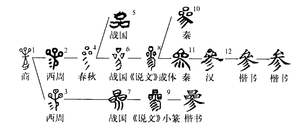 ,曑或省。”所從字形略有訛變,后隸變為“參”。《說文》所訓實際上是“動如參商”之“參”的本字,為星宿之名。此音為shēn。一般訓為“參與”、“參互”、“混同”等義的“參”則音cān。如《莊子·在宥》:“吾與日月參光。”而“參差”之“參”則音cēn。又假借為“驂”,如《史記·魏世家》:“韓康子為參乘。”一般稱為“人參”的“參”其本字則為“薓”。而“參雜”的“參”則又為“糝”字的假借。此外,“參”又假借為“摻”、“椮”、“嵾”、“傪”、“岑”等。“曑”、“參”今皆簡化為“參”。(王志平)